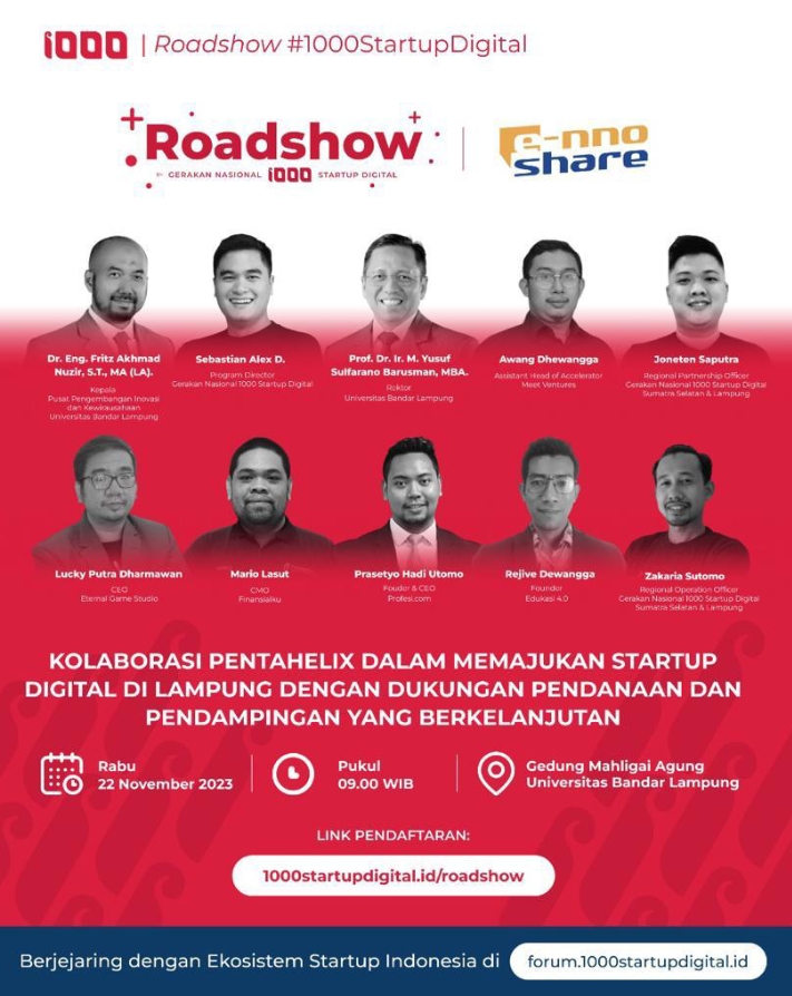“Rencananya kegiatan ini akan dilaksanakan pada 22 November 2023 mendatang bertempat di Convention Hall Mahligai Agung UBL mulai pukul 09.00 wib. Adapun tema yang diangkat adalah “Kolaborasi Pentahelix Dalam Memajukan Startup Digital di Lampung Dengan Dukungan Pendanaan dan Pendampingan Yang Berkelanjutan” yang menghadirkan pembicara seperti Rektor UBL, Program Director Gerakan Nasional 1000 Startup Digital dan beberapa CEO dari Startup nasional. Kegiatan ini terbuka untuk umum, silahkan bagi yang ingin mendaftar dapat mengakses link pendaftaran di 1000startupdigital.id/roadshow,” tutup Fritz. (rls/RS)