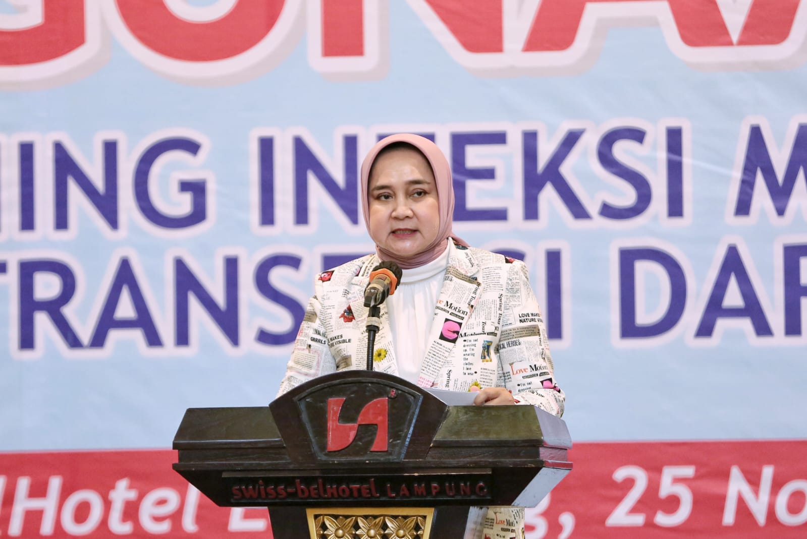 Ketua PMI Provinsi Lampung Ibu Riana Sari Arinal membuka Simposium Sehari Optimalisasi Penggunaan Nucleic Acid Amplification Testing (NAAT) untuk Skrining Infeksi Menular Lewat Transfusi Darah (IMLTD), yang dilaksanakan di Ballroom Swiss-bel Hotel, Bandar Lampung, Sabtu (25/11/2023).