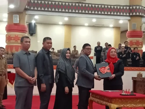 Walikota Bandar Lampung Hj. Eva Dwiana menghadiri rapat paripurna DPRD Kota Bandar Lampung penyampaian APBD tahun 2023, Senin (18/03/2024).