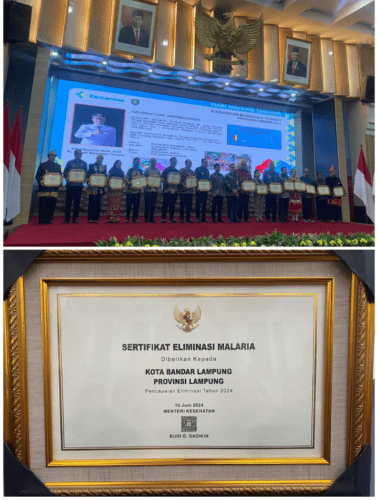Dalam rangka Peringatan Hari Malaria Walikota Bandar Lampung Hj. Eva Dwiana, menerima Sertifikat Malaria Kota Bandar Lampung yang langsung diBerikan oleh Wakil Menteri Kesehatan di Aula Siwabessy Gedung DR. Sujudi Kementerian Kesehatan RI., Senin, (24/6/2024).