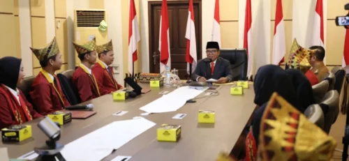 Pj. Gubernur Lampung Samsudin menerima kunjungan jajaran Civitas Universitas Teknokrat Indonesia dan BEM Universitas Teknokrat Indonesia, di Ruang Sakai Sambayan, Kantor Gubernur Lampung, Bandar Lampung, Selasa (24/9/2024).