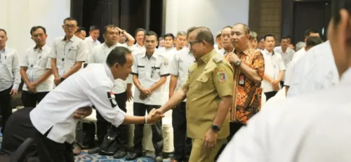 Pj. Gubernur Lampung Samsudin membuka Pelatihan Peningkatan Kapasitas Aparatur Pemerintah Desa dan Pengurus Kelembagaan Desa pada Program Penguatan Pemerintahan dan Pembangunan Desa (P3PD) di Hotel Sheraton Lampung, Bandarlampung, Senin (4/11/2024).