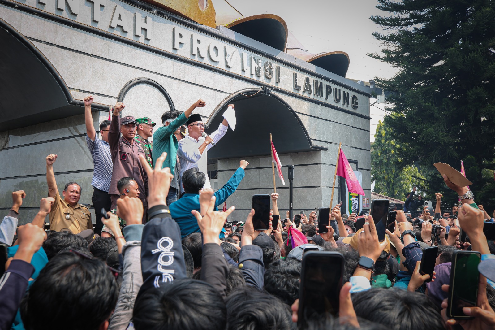 Suara Rakyat Didengar, Gubernur Lampung Rahmat Mirzani Djausal bersama jajaran Forum Koordinasi Pimpinan Daerah (Forkopimda) Provinsi Lampung menyambut ribuan massa demonstrasi dengan aksi damai di depan gerbang kantor Pemerintah Provinsi Lampung, Senin (1/9/2025).