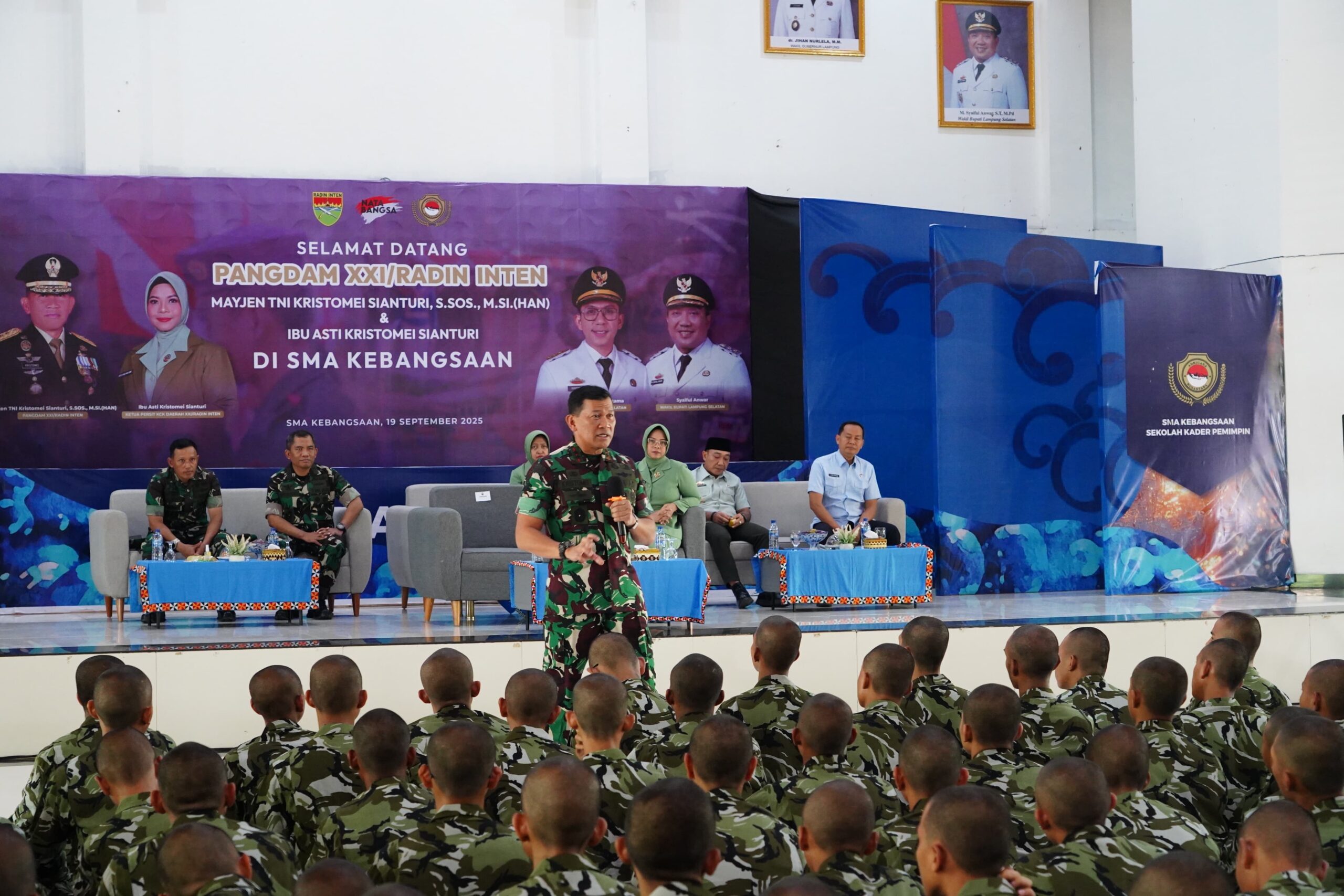 Pangdam XXI/Radin Inten Mayjen TNI Kristomei Sianturi, S.Sos., M.Si., (Han) didampingi Ketua Persit KCK Daerah XXI/Radin Inten Ny. Asti Kristomei Sianturi, Danrem 043/Gatam Brigjen TNI Haryantana, S.H., Ketua Persit KCK Koorcab Rem 043 PD XXI/RI, serta rombongan, melaksanakan kunjungan kerja ke wilayah Kodim 0421/Lampung Selatan, Jumat (19/09/2025).