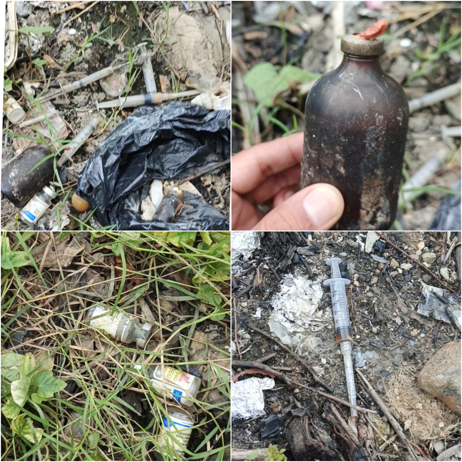 Di dua titik berbeda sisi kanan dan kiri belakang bangunan jarum suntik berserakan tanpa wadah pengaman, sementara botol-botol cairan obat dibiarkan terbuka bercampur dengan sampah lainnya.