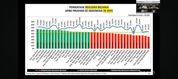Per 30 September 2025, rata-rata realisasi pendapatan daerah telah mencapai 70,27 persen, meningkat dibandingkan tahun sebelumnya sebesar 67 persen. Namun, untuk sisi belanja daerah baru terealisasi 56,07 persen, sedikit menurun dibanding periode yang sama tahun lalu (57,20 persen).